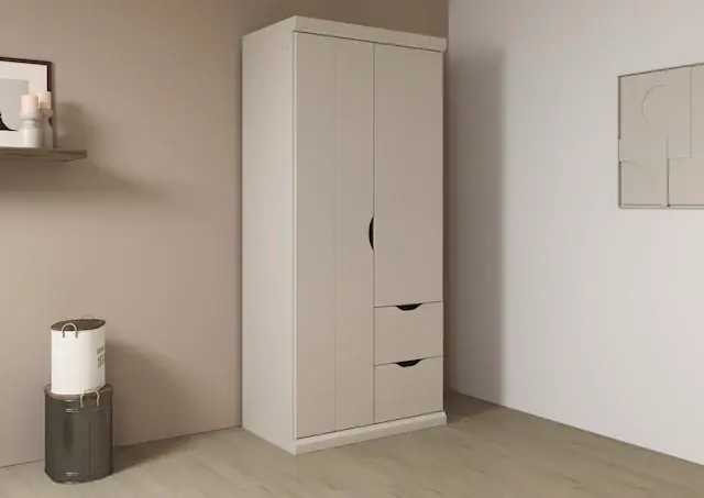 Moderner Drehtürenschrank im Landhauslook mit in der Front integrierten Schubladen für praktischen Stauraum. Kleiderschrank erhältlich in attraktiven Farben sowie verschiedenen Breiten. Griffloses Design mit Griffmulden für eine angenehme Handhabung des Schranks. Fachböden und Kleiderstangen im Kleiderschrank können individuell eingesetzt und in der Höhe verstellt werden. rauch Kleiderschränke sind 100% Made in Germany, ausgezeichnet mit dem Blauen Engel und dem Goldenen M