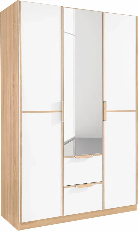 Mit praktischen Merkmalen und einer ansprechenden Optik bereichert der moderne Kleiderschrank der Marke rauch das Ambiente. Die Mitteltüren sind mit Spiegelelementen versehen und setzen so attraktive Akzente. Komplettiert wird das Gesamtbild durch dekorative Aufleistungen in Korpusfarbe und eleganten Kunststoffgriffen. Neben seiner geschmackvollen Optik ist das Schlafzimmermöbel vor allen Dingen mit seinem großzügigen Platzangebot eine Bereicherung.