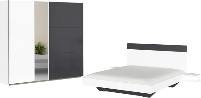 Set bestehend aus: Bett, 2er Set Nachttische und Schwebetürenschrank. Bequeme Bettanlage in 2 Breiten mit Hängenachttischen in schwereloser Optik. rauch Easy-Slide-Funktion für ein sanftes, leises Öffnen der Schwebetüren. Die Fachböden und Kleiderstangen können variabel in den Schrankelementen eingesetzt und in der Höhe verstellt werden. 100% Made in Germany, ausgezeichnet mit dem Blauen Engel und dem Goldenen M