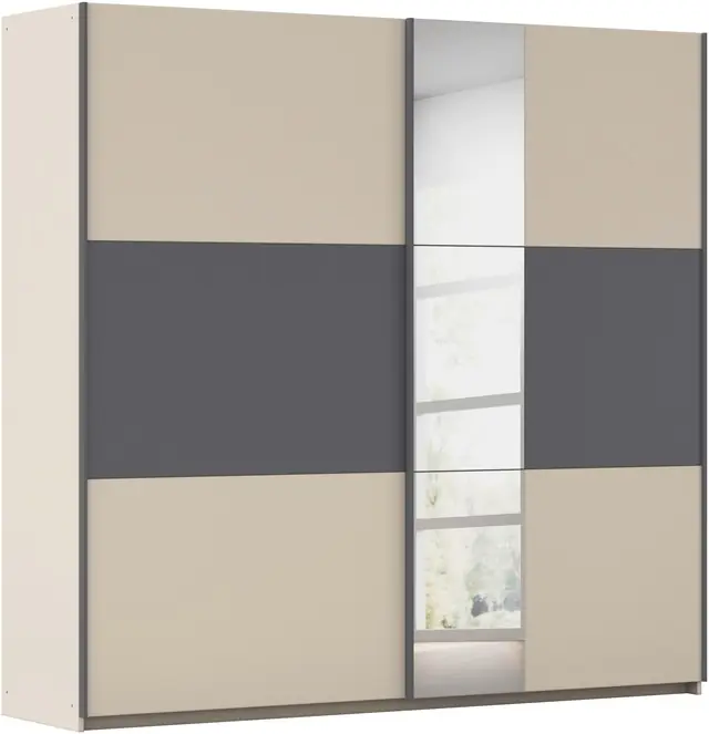Optionale Spiegelelemente erzeugen optische Weite im Raum. Moderne und robuste Metallgriffleisten in Graumetallic. Fachböden und Kleiderstangen können individuell eingesetzt und in der Höhe verstellt werden. Stabile Schwebetüren-Laufschienen aus Metall für ein sanftes öffnen der Schwebetüren. rauch Kleiderschränke sind 100% Made in Germany, ausgezeichnet mit dem Blauen Engel und dem Goldenen M