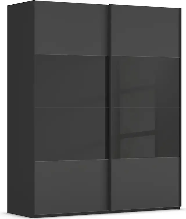 Moderner Schwebetürenschrank mit edler Mix-Glasfront sowie Metallgriffleisten in passender Farbe. Eyecatcher: Großflächige Schwebetüren mit jeweils vier Frontelementen im Glasmix – Glänzend und Matt. Kleiderschrank erhältlich in zahlreichen Farbvarianten, unter anderem auch in „beige“. Fachböden und Kleiderstangen im Kleiderschrank können individuell eingesetzt und in der Höhe verstellt werden. 100% Made in Germany, ausgezeichnet mit dem Blauen Engel und dem Goldenen M