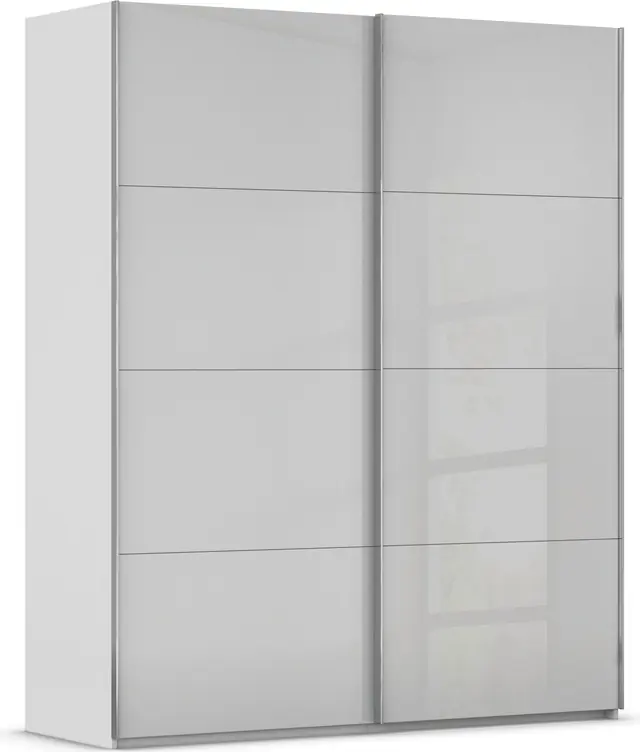 Moderner Schwebetürenschrank mit edler Glasfront – glänzend oder matt – sowie Metallgriffleisten in passender Farbe. Eyecatcher: Großflächige Schwebetüren mit jeweils vier Glaselementen. Kleiderschrank erhältlich in zahlreichen Farbvarianten, unter anderem auch in „beige“. Fachböden und Kleiderstangen im Kleiderschrank können individuell eingesetzt und in der Höhe verstellt werden. 100% Made in Germany, ausgezeichnet mit dem Blauen Engel und dem Goldenen M