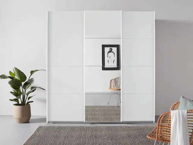 Zusätzlich: 2 große Einlegeböden, Wäscheeinteilung mit 3 Innenschubladen und 2 weiteren Einlegeböden. Innenschubladen können in der Höhe variabel positioniert werden. Fachböden und Kleiderstangen können individuell eingesetzt und in der Höhe verstellt werden. rauch Easy-Slide-Funktion für ein sanftes, leises Öffnen der Schwebetüren. 100% Made in Germany, ausgezeichnet mit dem Blauen Engel und dem Goldenen M