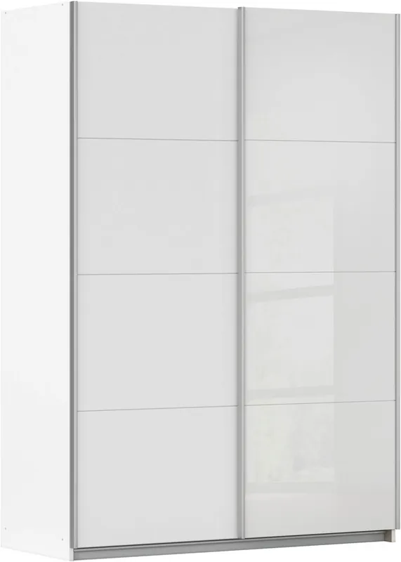 Zeitloser Schwebetürenschrank mit 1 Glastür. Türen bestehen jeweils aus 4 Holz- und 4 Glaselementen. Frontelemente können beliebig angebracht werden. In mehreren Farben erhältlich. Made in Germany!