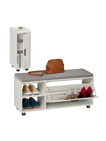 Zwei Möbel, ein Gedanke: Stilvoll Ordnung schaffen. Dieses Set aus Schuhkommode und Dielenschrank verwandelt jeden Flur in eine Wohlfühlzone. Die Schuhbank bietet offenen Stauraum und Platz für sechs Paar Schuhe, während die Hochkommode Mützen und mehr in zwei Türfächern verstaut. Dabei lädt die Ablage zur Dekoration ein. Das gepolsterte Kissen der Schuhbank sorgt für Sitzkomfort beim Schuheanziehen. Dank durchdachter Rundfüße stehen die robusten Flurmöbel sicher auf jedem Untergrund.Schuhbank mit Schrank im Detail – Schuhbank Maße H x B x T: ca. 48,5 x 100 x 35,5 cm / ca. 18 kg – Schuhbank Traglast: max. 120 kg – Schrank Maße H x B x T: ca. 66,5 x 24 x 35,5 cm / ca. 9,4 kg – Schrank Traglast: max. 15 kg – Material: MDF, Polyester, Schaumstoff, Eisen – In verschiedenen FarbenGarderoben-Set mit Stauraum – Schuhkipper ohne Einlegeboden H x B x T: ca. 18,5 x 60 x 31 cm – Höhen (oben/ unten) mit Einlegeboden: ca. 8,5/ 10,5 cm, 10/ 8,5 cm – Einlegeboden B x T: ca. 64 x 14,5 cm – Offene Fächer der Schuhbank H x B x T: je ca. 17 x 30 x 34 cm – Obere Schrankablage: H x B x T: ca. 3 x 21 x 32,5 cm – Oberes Schrankfach H x B x T: ca. 26 x 21 x 29,5 cm – Unteres Schrankfach H x B x T: ca. 28 x 21 x 32,5 cmSchuhregal mit Flurschrank – Zweiteiliges Set bestehend aus Schuhkommode und Regal – Optimal für Flur, Diele oder Schlafzimmer zur platzsparenden Organisation – Schuhbank mit Klappfach für bis zu 6 Paar Schuhe und 2 offenen Fächern – Schrank mit 2 Türfächern und oberer Ablagefläche für Dekoration, Schlüssel etc. – Graues Sitzkissen aus Stoff für bequemen Sitzkomfort beim Schuheanziehen – Rutschfeste Rundfüße sorgen für sicheren Stand auf jedem Boden – Metallgriffe setzen optische Akzente und erleichtern das ÖffnenLieferumfang – 1x Schuhbank in Einzelteilen – 1x Flurschrank in Einzelteilen – Ohne Deko