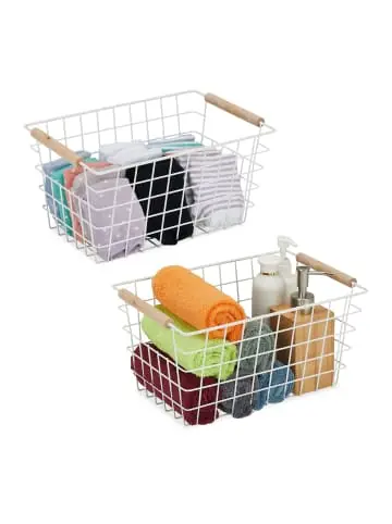 Mit den Metallkörben im 2er Set holst Du Dir praktische und zugleich dekorative Ordnungshelfer nach Hause. Ob als Badezimmerkörbe für Kosmetik und Handtücher, Küchenkörbe für Reinigungsutensilien oder als Schrankkörbe für Socken und Accessoires – mit den Allzweckkörben verstaust Du alle Kleinigkeiten des Alltags ordentlich und übersichtlich. Dabei überzeugen die Eisenkörbe mit ihrem dekorativen Gitterdesign und den natürlichen Griffen aus Holz.Drahtkorb 2er Set im Detail – Größe H x B x T: ca. 16 x 31 x 21 cm – Max. Traglast: je 10 kg – Gewicht: je ca. 400 g – Material: Eisen, Buchenholz – In verschiedenen FarbenEckige Aufbewahrungskörbe aus Metall – Vielseitige Ordnungskörbe für Wohnzimmer, Schlafzimmer, Bad etc. – Zum Verstauen von Küchen- und Badutensilien, Accessoires uvm. – Griffe für einfachen Transport oder zur leichten Entnahme aus dem Regal – Dekoratives Gitterdesign mit natürlichen Holzgriffen als Hingucker – Aufbewahrungskörbchen aus robustem Metall für LanglebigkeitLieferumfang – 2x Gitterkorb – Dekoartikel sind nicht im Lieferumfang enthalten