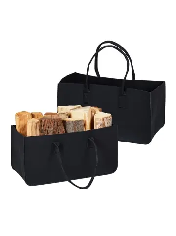 Mit diesem Brennholzkörben im praktischen 2er Set lagerst Du Kaminholz nicht nur zuverlässig sondern auch stilvoll. Die universell einsetzbaren Filztaschen fügen sich durch ihr robustes Design optimal in Dein Wohnzimmer ein und bieten viel Platz, um Brennholz zu lagern. Aber auch Zeitschriften, Spielzeuge, Wäsche oder der Einkauf kann in den großen Filzkörben verstaut werden. Dank der handlichen Tragegriffe können die Aufbewahrungskörbe leicht transportiert werden.Filzkörbe im Detail – Maße H x B x T: ca. 25 x 50 x 25 cm – Fassungsvermögen: je ca. 28 l – Traglast: je bis 12 kg – Gewicht: je ca. 300 g – Material: Filz – Farbe: SchwarzPraktische Feuerholztaschen im 2er Set – 2 robuste Taschen aus langlebigem Filz in Schwarz – Filztaschen sind ideal für die Lagerung von Kaminholz – Auch als Aufbewahrung- oder Einkaufskörbe verwendbar – Bei Nichtgebrauch platzsparend zusammenfalten und verstauen – Leicht zu transportieren dank der stabilen TragegriffeLieferumfang – 2x Filztasche – Dekoartikel sind nicht im Lieferumfang enthalten