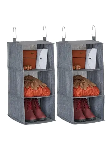 Mit diesen Hängeregalen bringst Du Ordnung in Deinen Kleiderschrank und sorgst für zusätzlichen Stauraum an der Kleiderstange. Die Hängeorganizer im 2er Set verfügen je über 3 Fächer und eignen sich zum Verstauen von Kleidung. Die verstärkten Böden sorgen dabei für die nötige Stabilität der Stoffregale, die ganz einfach mithilfe von je 2 Metallhaken aufgehängt werden. Bei Nichtgebrauch lassen sich die Schrankorganizer platzsparend zusammenfalten und können auch beim Camping verwendet werden.Kleiderschrank Hängeregale im Detail – Gesamtmaße H x B x T: ca. 73 x 30 x 30 cm – Höhe ohne Haken: ca. 60 cm – Innenmaße je Fach H x B x T: ca. 19,5 x 29,5 x 29,5 cm – Max. Traglast je Fach: ca. 2,5 kg – Gewicht: ca. 530 g – Material: Polyester, Kunststoff, Pappe – Farbe: Grau, SchwarzHängende Kleiderschrank-Organizer im 2er Set – Schaffe zusätzlichen Ablageplatz im Kleiderschrank – Zum Aufhängen an der Kleiderstange mithilfe von Haken – Je 3 Fächer für Kleidung, Schuhe, Accessoires und mehr – Fertigung aus Polyester und Kunststoff mit verstärkten Böden – Lassen sich schnell zusammenfalten und auf Reisen mitnehmen – Mit einer seitlichen Netztasche für zusätzlichen Stauraum – Die Reinigung mit einem feuchten Tuch wird empfohlenLieferumfang – 2x Kleiderschrank-Hängeorganizer – Dekoartikel sind nicht im Lieferumfang enthalten