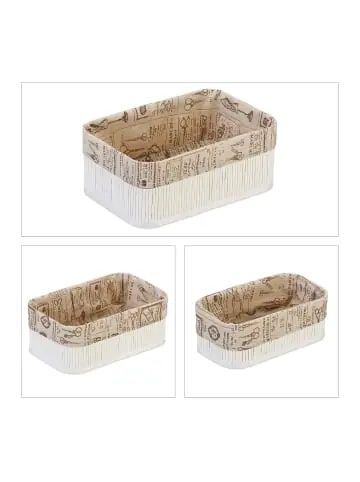 Diese Aufbewahrungskörbe im praktischen 3er Set bringen mehr Ordnung in Dein Zuhause. Durch die drei verschiedenen Größen lassen sich alle Kleinigkeiten des Alltags verstauen – ob Badartikel, Kinderspielzeug oder Näh- und Bastelutensilien. Dabei überzeugen die Regalkörbe nicht nur durch den Stoff im Vintage-Design, sondern auch durch ihre Verarbeitung aus robustem Bambus und einer stabilen Bodenplatte. Das Korb Set bietet idealen Platz für kleine Dinge und passt in jeden Raum und jedes Regal. Aufbewahrungskorb im 3er Set – Maße Großer Dekokorb H x B x T: ca. 12 x 30 x 20 cm, 320 g – Maße Mittlerer Dekokorb H x B x T: ca. 10 x 26 x 16 cm, 240 g – Maße Kleiner Dekokorb H x B x T: ca. 8 x 22 x 12 cm, 160 g – Materialien: Bambus, Polyester, MDF – Farbe: Weiß, Beige Regalkörbe aus Bambus – Für Handtücher, Kosmetik, Spielzeug uvm. – Stoffeinsatz im Vintage-Design – Fügen sich dezent in jeden Raum ein – In 3 verschiedenen Größen – Aus robustem, weiß gefärbtem BambusLieferumfang – 3x Aufbewahrungskorb – Dekoartikel sind nicht im Lieferumfang enthalten