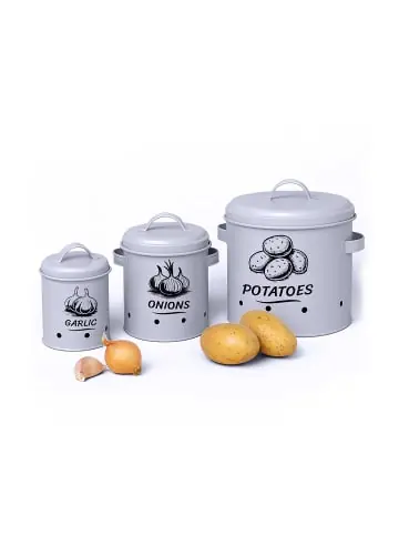 Die Vorratsbehälter bieten optimale Bedingungen zur Lagerung von Kartoffeln, Zwiebeln und Knoblauch. In den Zwiebelboxen wird das Gemüse dunkel und trocken gelagert, wodurch eine Keimbildung verhindert wird. Die Belüftungslöcher am Boden sorgen dabei für eine optimale Luftzufuhr. Auf diese Weise bleiben die Lebensmittel lange frisch. Dank des dekorativen Designs mit Print werden die Kartoffeldosen zu einem Hingucker in Deiner Küche.Kartoffel Aufbewahrungsbox 3er Set im Detail – Maße Kartoffelbehälter H x B x T: ca. 21 x 26 x 23,5 cm, ca. 0,6 kg – Maße Zwiebelbehälter H x B x T: ca. 19 x 18 x 14,5 cm, ca. 350 g – Maße Knoblauchbehälter H x D: ca. 17 x 12 cm, ca. 200 g – Material: Stahl, Eisen – In verschiedenen Farben erhältlichRunde Kartoffelboxen aus Metall – 3er Set zur Aufbewahrung von Kartoffeln, Zwiebeln und Knoblauch – Trockene und dunkle Lagerung verhindert Keimbildung – Belüftungslöcher am Boden sorgen für eine gute Luftzirkulation – Optimale Aufbewahrungsbedingungen für längere Haltbarkeit – Mit praktischen Henkeln für einfachen Transport – Deckel mit Griff – Dekoratives Design mit Print als Hingucker in der KücheLieferumfang – 1x Kartoffel-Aufbewahrungsbox – 1x Zwiebel-Aufbewahrungsbox – 1x Knoblauch-Aufbewahrungsbox – Dekoartikel sind nicht im Lieferumfang enthalten