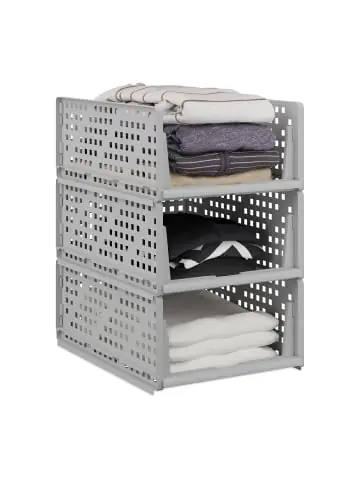 Wenn Du für mehr Ordnung in Deinem Kleiderschrank sorgen möchtest, dann sind diese praktischen Aufbewahrungsboxen im 3er Set genau das richtige für Dich. Die stapelbaren Schrank-Organizer lassen sich wie Schubladen herausziehen, sodass Pullover, T-Shirts, Hosen und Co. im Nu ordentlich verstaut und leicht zugänglich sind. Auch im Badezimmer finden die Organizer Verwendung und eignen sich ideal für die Aufbewahrung von Handtüchern. Dank des Stecksystems lassen sie sich schnell auf- und abbauen.Schrankkörbe im Detail – Größe S Maße H x B x T: 13 x 33,5 x 43,5 cm / ca. 550 g – Größe M Maße H x B x T: 18 x 33,5 x 43,5 cm / ca. 650 g – Größe L Maße H x B x T: 24,5 x 33,5 x 43,5 cm / ca. 750 g – Traglast: je ca. 3 kg – Traglast für Ebene 2 und 3: je ca. 2 kg – Material: Kunststoff – In verschiedenen FarbenSchrank-Organizer aus Kunststoff – Größe S gefaltet H x B x T: ca. 4,5 x 33,5 x 43,5 cm – Größe M gefaltet H x B x T: ca. 4,5 x 33,5 x 43,5 cm – Größe L gefaltet H x B x T: ca. 6 x 33,5 x 43,5 cmVielseitige Kleideraufbewahrung zum Stapeln – Platzsparende und effiziente Aufbewahrungslösung für Schränke – Ordnungssystem individuell aufeinanderstapeln – Im 3er Set – Einsätze lassen sich wie Schubladen aus dem Schrank ziehen – Sorgen für Ordnung und Übersicht – Für Kleidung, Handtücher uvm. – Optimale Größe für verschiedene Schranktypen – Auch im Bad – Einfacher und schneller Auf- bzw. Abbau dank StecksystemLieferumfang – 3x Kleiderschrank-Organizer in Farbe und Größe nach Wahl – Dekoartikel sind nicht im Lieferumfang enthalten