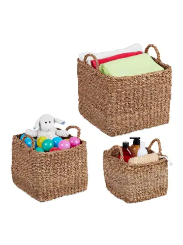 Mit dem 3er Aufbewahrungskorb-Set holst Du Dir praktische und zugleich dekorative Ordnungshelfer nach Hause. Ob als Badezimmerkörbe für Kosmetik und Handtücher, Regalkörbe für Socken und Unterwäsche im Schlafzimmer oder Utensilienkörbe im Wohnzimmer – dank der 3 verschiedenen Größen lassen sich alle Kleinigkeiten des Alltags übersichtlich in den Flechtkörben verstauen. Dabei überzeugen die Körbchen aus natürlichem Seegras mit ihrem dekorativen, geflochtenen Design.Aufbewahrungskorb Set im Detail – Maße Korb S H x B x T: ca. 20 x 25 x 25 cm / ca. 310 g – Maße Korb M H x B x T: ca. 25 x 30 x 30 cm / ca. 560 g – Maße Korb L H x B x T: ca. 30 x 35 x 35 cm / ca. 830 g – Material: Seegras – Farbe: NaturVielseitige Aufbewahrungsboxen – Aus geflochtenem Seegras – Dekorativ und funktional – Stabiles, natürliches Material – Ineinander stapelbar – Großzügiger Stauraum in 3 verschiedenen Größen- Aufbewahrungsmöglichkeit für Bad, Wohnzimmer uvm. – Ideal für Accessoires, Kosmetik, Spielzeug uvm. – Mit Griffen zum einfachen Herausziehen aus Regal & Co.Lieferumfang – 3x Regalkorb – Dekoartikel sind nicht im Lieferumfang enthalten