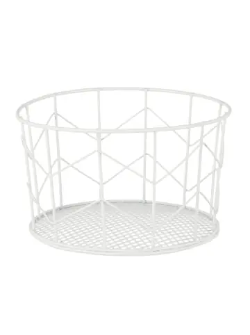 Der Metallkorb ist ein echter Aufbewahrungs-Allrounder und bietet stilvoll Stauraum für kleinere Gegenstände. Das runde Körbchen passt in jeden Raum und jedes Regal. Verstaue Kosmetikartikel oder Kleidungsstücke wie Socken, Unterwäsche, Tücher und Accessoires platzsparend. Nutze den Korb auch für Deko oder als kleinen Tisch-Papiereimer am Arbeitsplatz. Die geometrischen Metallstreben verleihen dem Dekokorb seinen Vintage Charme und machen ihn zu einem dekorativen Hingucker.Drahtkorb im Detail – Größe H x D: ca. 12,5 x 22 cm – Innendurchmesser oben: ca. 21 cm – Bodendurchmesser innen: ca. 18 cm – Material: Eisen – Farbe: Weiß – Im 3er SetStylischer Korb-Organizer zur Aufbewahrung – Praktisches Aufbewahrungskörbchen für zu Hause – Korb im Vintage Gitterdesign setzt Akzente – Stauraum für Accessoires, Kosmetik, Deko etc. – Metallkorb mit hohem Rand birgt viel Platz für kleine Dinge – In klassischen matten oder metallisch glänzenden FarbtönenLieferumfang – 3x Drahtkorb – Dekoartikel sind nicht im Lieferumfang enthalten