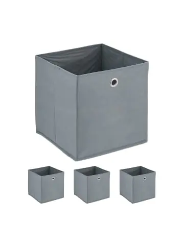 Schaffe mit diesen Verstauboxen mehr Ordnung in Deinem Zuhause. Utensilien, die offen herumliegend für Unordnung sorgen, finden in den quadratischen Stoffboxen einen Platz. Du kannst Spielzeug, Kuscheltiere, kleine Handtücher und mehr übersichtlich in den Ordnungsboxen aufbewahren. Dank ihrer Größe passen die Boxen in zahlreiche Fächer diverser Regalsysteme. Dabei sorgt der praktische Eingriff für eine einfache Handhabung. Bei Nichtgebrauch können die stabilen Boxen zusammengefaltet werden.Einschubkorb im Detail – Maße H x B x T: ca. 30 x 30 x 30 cm – Innenmaße H x B x T: ca. 29 x 29,5 x 29,5 cm – Gewicht: ca. 530 g – Material: Vlies, Pappe, Eisen – Farbe: Grau – Im 4er SetPraktische Würfelregalbox aus Stoff – 4er Set Ordnungsboxen für Kleidung, Accessoires und mehr – Vielseitig einsetzbar als Spielzeug- oder Kinderzimmerbox – Ideal auch als Badezimmerkiste für diverse Badartikel – Perfekte Passform für quadratische Kommodenfächer – Praktischer Eingriff zum Herausziehen aus Würfelregalen – Stoffbox bei Nichtgebrauch einfach zusammenfaltenLieferumfang – 4x Faltaufbewahrungsbox – Dekoartikel sind nicht im Lieferumfang enthalten