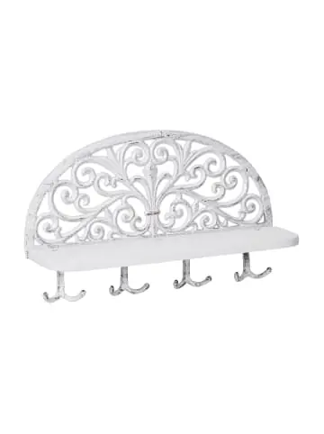 Die Garderobe bietet Ihnen einige Optionen, den Platz in Ihrem Flur optimal zu nutzen. Hängen Sie Schlüssel oder Jacken griffbereit an die 4 Doppelhaken auf. Zusätzlichen Stauraum bietet die Ablage aus Holz. Darüber hinaus ist die Schlüsselleiste zu empfehlen, wenn Sie Ihren Eingangsbereich um einen echten Hingucker bereichern möchten. Denn das Antik-Design mit seinen floralen Ornamenten kommt dank der rustikalen Optik des Gusseisens besonders gut zur Geltung.Wandgarderobe im Detail – Gesamtmaße H x B x T: ca. 23 x 39 x 11,5 cm – Maße Ablage B x T: ca. 39 x 11 cm – Abstand Bohrlöcher: ca. 30,5 cm – Traglast Ablage: ca. 1,5 kg- Traglast Haken: ca. 4 kg – Material: Gusseisen, Holz – Gewicht: ca. 1,3 kg – Farbe: Weiß – Im 4er SetSchlüsselboard mit 4 Doppelhaken – Garderobe für Flur oder Eingangsbereich – Mit Ornamenten im nostalgischen Design – Aus Gusseisen mit rustikaler Oberfläche – 4 Doppelhaken für Jacken oder Schlüssel – Mit Holzablage für kleinere GegenständeLieferumfang – 4x Wandgarderobe in Einzelteilen – Ohne Montagematerial für die Wand – Mit Anleitung – Dekoartikel sind im Lieferumfang nicht enthalten