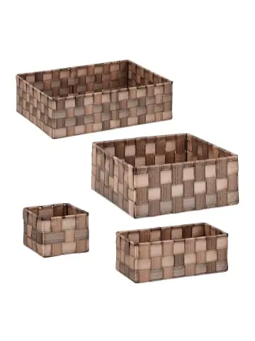 Mit dem 6-teiligen Aufbewahrungskorb-Set bist Du perfekt ausgerüstet, um verschiedene Dinge des Alltags übersichtlich aufzubewahren. Verstaue in den geflochtenen Dekokörben in 4 Größen Kosmetik im Bad, Socken und Unterwäsche im Kleiderschrank oder verwende die Utensilienkörbe als dekorative Aufbewahrungslösung in Wohnzimmer und Flur. Auch als Schubladen-Organizer für das Büro machen die Flechtkörbe eine gute Figur. Bei Nichtgebrauch können sie platzsparend ineinander gestapelt werden.Aufbewahrungskorb Set im Detail – Maße großer Korb H x B x T: ca. 10,5 x 35,5 x 26 cm / ca. 340 g – Maße mittlerer Korb H x B x T: ca. 10 x 23 x 23 cm / ca. 230 g – Maße kleine Körbe H x B x T: je ca. 8,5 x 21 x 11 cm / ca. 130 g – Maße mini Körbe H x B x T: je ca. 8,5 x 10,5 x 10,5 / ca. 90 g – Traglast: ca. 3 kg – Material: Kunststoff (PP), Metall – Verschiedene FarbenFlechtkörbchen zur Aufbewahrung in Bad und Co. – Ideal für Kosmetik und andere Badutensilien – Praktisch auch in Wohn-, Schlaf- oder Kinderzimmer – 4 verschiedene Größen passend für jeden Bedarf – Geflochtene Holzoptik setzt dekorative Akzente – Körbe bei Nichtgebrauch ineinander stapelbarLieferumfang – 6x Aufbewahrungskorb in 4 verschiedenen Größen – Dekoartikel sind nicht im Lieferumfang enthalten