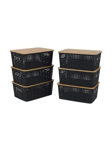 Schaffe mit diesen Aufbewahrungskörben aus Kunststoff und Bambus mehr Ordnung in Deinem Zuhause. Die vielseitigen Boxen eignen sich ideal zur Aufbewahrung von Kosmetik, Accessoires, Spielzeug, Bastelzubehör oder Deko in Bad, Wohn-, Schlaf- oder Kinderzimmer. Die perforierte Struktur sorgt für gute Luftzirkulation, während der Bambusdeckel den Inhalt schützt. Dank Griffaussparungen und rutschfester Unterseite sind die Körbe besonders praktisch im Alltag.Aufbewahrungsbox im Set – Maße H x B x T: ca. 10,5 x 25,5 x 18 cm – Innenmaße H x B x T: ca. 10 x 16 x 23, 5 cm – Griffaussparungen H x B: je ca. 3,5 x 8 cm – Beschriftungsfläche H x B: ca. 3 x 7 cm – Gewicht: je 380 g – Material: Kunststoff, Bambus – Verschiedene FarbenAufbewahrungskisten mit Deckel – Ordnungsboxen für Bad, Wohn-, Schlaf-, Arbeits- und Kinderzimmer – Für Kosmetik, Spielzeug, Accessoires, Bastelzubehör, Büroartikel, Deko uvm. – Praktische Grifflöcher an den Seiten zum Tragen der Kisten – Boxen aus robustem Kunststoff mit natürlichem Bambusdeckel – Perforierte Struktur sorgt für bessere Luftzirkulation des Inhalts – Glatte Flächen an den Seiten zum Anbringen von Beschriftungsstickern – Kisten sind einfach übereinander stapelbar – Leicht Reinigung mit einem feuchten Tuch – Unterseite mit Anti-Rutsch-Struktur für sicheren StandLieferumfang – Ordnungsboxen Set in gewählter Stückzahl und Farbe – Dekoartikel sind nicht im Lieferumfang enthalten