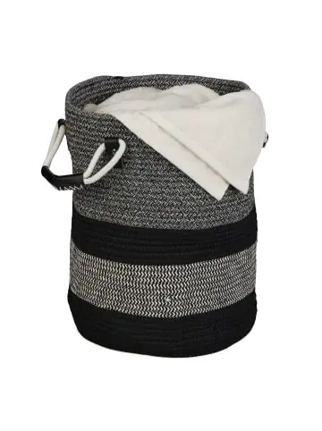Mit diesem Aufbewahrungskorb aus Baumwolle sorgst Du nicht nur für Ordnung, sondern schaffst auch einen tollen Blickfang im Boho-Stil. In dem dekorativen Stoffkorb finden Wäsche, Handtücher, Decken und Spielzeug einen Platz. Mit den zwei Griffen kann der Wäschekorb einfach angehoben und transportiert werden. Nutze den Baumwollkorb als Ordnungshelfer im Wohnzimmer, Bad oder Kinderzimmer. Bei Bedarf lässt sich der Korb einfach zusammenfalten und platzsparend verstauen.Aufbewahrungskorb im Detail – Maße H x B x T: ca. 40 x 43 x 33 cm- Gewicht: ca. 1 kg – Traglast: ca. 10 kg- Material: Baumwolle, PU – Farbe: Anthrazit, SchwarzDekorativer Flechtkorb aus Baumwolle – Zum Verstauen von Handtüchern, Decken, Wäsche, Spielzeug uvm. – Sorgt für mehr Ordnung im Bad, Wohn- und Kinderzimmer – Geflochtener Baumwollkorb passt zu Einrichtungen im Boho-Stil – Mit Griffen für leichtes Hochheben und Transportieren – Bei Bedarf einfach zusammenfalten und platzsparend verstauenLieferumfang – 1x Badkorb – Dekorationsartikel sind nicht im Lieferumfang enthalten