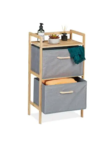 Mit dem kompakten Schubladenregal aus Bambus schaffst Du praktischen Stauraum in kleinen und großen Bädern. Das Handtuchregal überzeugt mit einer cleveren Kombination aus offener Ablage und 2 Stoffschubladen. Während die Ablage Abstellfläche für Kosmetik oder andere Badutensilien bietet, sind die Körbe ideal zum Einsortieren von Schmutzwäsche oder zum Verstauen von Handtüchern. Die grauen Wäschekörbe lassen sich zu beiden Seiten einfach ausziehen und können vollständig entnommen werden.Stoffkommode im Detail – Gesamtmaße H x B x T: 76 x 43 x 27 cm – Innenmaße je Schublade ca. 25 x 39,5 x 26 cm – Traglast pro Schublade: max. 5 kg – Tragelast Ablage: max. 6 kg – Gewicht: ca. 3,6 kg – Material: Bambus, Polyester, Pappe – Farbe: Natur, GrauWäschesammler Regal für das Badezimmer – Schafft praktischen Stauraum in kleinen und großen Bädern – Dekorativer Materialmix aus Bambus und grauem Stoff – Eine offene Ablage zum Abstellen von Kosmetik- und Badartikeln – Wäsche oder Handtücher in die 2 Stoffschubladen einsortieren – Die faltbaren Stoffkörbe lassen sich einfach raus- und reinschieben – Leichter Transport dank Griffen am Bambussgestell und an WäscheboxenLieferumfang – 1x Bambus Badezimmerregal in Einzelteilen – 2x Stoffkörbe – Mit Anleitung und Montagematerial – Dekoartikel sind nicht im Lieferumfang enthalten