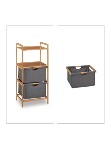 Das moderne Badezimmerregal ist ideal für kleine und große Bäder und punktet mit einer Kombination aus offenen Fächern und 2 Stoffkörben. Während die Ablagen praktische Abstellfläche für Kosmetik und andere Badutensilien bieten, sind die Körbe ideal zum sortierten Aufbewahren der Schmutzwäsche oder zum Verstauen von Handtüchern. Die grauen Wäschekörbe lassen sich zu beiden Seiten einfach ausziehen und können vollständig entnommen werden. Der gemaserte Bambus setzt natürliche Akzente im Bad.Badregal mit Wäschekörben im Detail- Maße H x B x T: ca. 96 x 44 x 34 cm- Traglast Ablage: ca. 6 kg- Traglast Körbe: ca. 5 kg- Gewicht: ca. 3,7 kg- Material: Bambus, MDF, Polyester- Farbe: Natur, grauWäschesammler Regal aus Bambus- Ablageflächen B x T: ca. 37 x 29,5 cm- Ablagenabstand: ca. 26 cm- Innenmaße Körbe H x B x T: ca. 20,5 x 35 x 29 cm- Bodenfreiheit: ca. 8 cmBambusregal mit offenen Ablagen und Stoffkörben – Schafft praktischen Stauraum in kleinen und großen Bädern – 2 offene Fächer zum Abstellen von Kosmetik, Waschmittel etc. – Stoffkörbe zum Sortieren der Schmutzwäsche oder für Handtücher – Wäschekörbe lassen sich in beide Richtungen ausziehen und entnehmen – Bambus setzt natürliche Akzente im Badezimmer – Tolle Kombi mit grauem StoffLieferumfang – 1x Korbregal in Einzelteilen – Anleitung und Montagematerial – Dekorationsartikel sind im Lieferumfang nicht enthalten
