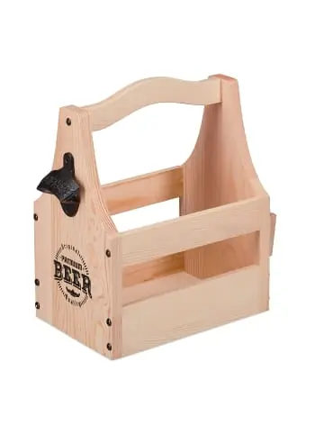 Während Man(n) bei handelsüblichen Bierhaltern aus Pappe oft Angst um seine geliebten Durstlöscher haben muss, trägt er sie mit diesem Holzbierträger cool und sicher von A nach B. Bis zu sechs 0,5-Liter Flaschen können in dem Flaschenkorb transportiert werden. Dank des seitlichen Flaschenöffners und der Bierdeckel steht auch dem sofortigen Genuss des kühlen Blonden nichts im Wege. Befüllt mit verschiedenen Biersorten ist die Flaschentrage eine tolle Geschenkidee zum Vatertag oder Geburtstag.Bierträger im Detail- Gesamtmaße H x B x T: ca. 30 x 28,5 x 16 cm- Innenmaße H x B x T: ca. 14 x 20,5 x 14 cm- Abstand Henkel – Boden: ca. 24,5-26 cm- Bierdeckel D: ca. 11 cm- Max. Traglast: 5 kg – Gewicht: ca. 1 kg- Material: Kiefernholz, Eisen – Farbe: NaturBier-Männerhandtasche aus Holz- Zum Transportieren von bis zu 6 Flaschen à 0,5 Liter – Stabile und dekorative Alternative zu 6er Trägern aus Pappe – Perfekt für Strandausflüge, Picknicks, Grillabende uvm. – Mit praktischem Flaschenöffner und 3 Bierdeckeln – Befüllt mit Bier eine coole Geschenkidee für den Mann Lieferumfang- 1x Holz-Flaschenträger- 3x Bierdeckel – Dekoartikel sind im Lieferumfang nicht enthalten