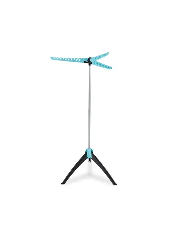 Dieser praktische Kleiderständer ist ideal zum Aufhängen von Kleiderbügeln. Egal ob Sie Ihre Pullover, T-Shirts und Kleider zum Trocknen aufhängen möchten oder einen Platz für Ihre Blusen und Hemden beim Bügeln suchen – der kompakte Wäschehalter bietet mit seinen 3 Armen ausreichend Platz. In den insgesamt 33 Einkerbungen hängen Ihre Kleiderbügel sicher und ohne zu verrutschen. Wird der Standtrockner gerade nicht benötigt lässt er sich einfach zusammenklappen und platzsparend verstauen.Bügelwäscheständer im Detail – Maße aufgeklappt H x D: ca. 128 x 56,5 cm – Maße zusammengeklappt: ca. 108 x 17 cm – Länge je Flügel: ca. 36 cm – Traglast: ca. 12 kg, ca. 4 kg je Stange – Gewicht: ca. 1 kg – Material: ABS-Kunststoff, Eisen – Farbe: Türkis, silber, schwarzKlappbarer Wäscheständer – 3 Flügel bieten Platz für bis zu 33 Kleiderbügel – Ideal für Hemden, Kleider, Pullover, T-Shirts uvm. – Bei Nichtbenutzung einfach zusammenklappen – Dank geringem Gewicht einfach transportieren – Für drinnen, Balkon oder Terrasse – Zum Trocknen und Lüften von KleidungLieferumfang – 1x Wäschespinne – Dekorationsartikel sind nicht im Lieferumfang enthalten
