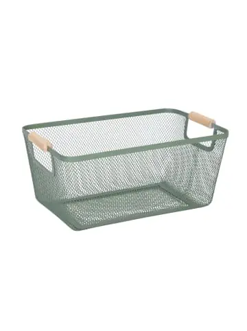 Der Metallkorb ist ein echter Aufbewahrungs-Allrounder und bietet Dir Stauraum für diverse Haushaltsgegenstände. Dabei macht das geräumige, eckige Körbchen in jedem Raum eine gute Figur. Nutze den Utensilienkorb für Kosmetik oder Gästehandtücher im Bad oder verstaue Kleidungsstücke wie Socken, Unterwäsche und Accessoires platzsparend. In der Küche bringt der Allzweckkorb Ordnung in Deine verpackten Vorräte. Der Mix aus Metall und Holz verleiht dem Gitterkorb einen modernen Look.Drahtkorb im Detail – Maße H x B x T: ca. 16,5 x 37 x 22,5 cm – Innenmaße H x B x T: ca. 15,5 x 35 x 22 cm – Max. Traglast: 5 kg- Gewicht: ca. 500 g – Material: Stahl, Holz – Verschiedene FarbenModerner Aufbewahrungskorb aus Metall – Praktisches Aufbewahrungskörbchen für zu Hause- Vielseitig nutzbar in Bad, Küche, Wohnzimmer etc.- Für Kosmetik, verpackte Lebensmittel, als Dekokorb und mehr- Offenes Design aus Metalldraht bietet guten Überblick über Inhalt- Griffe aus Holz setzen optische Kontraste zum MetallkörbchenLieferumfang – 1x Vorratskorb in Farbe nach Wahl – Dekoartikel sind im Lieferumfang nicht enthalten