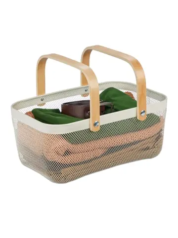 Der Metallkorb ist ein echter Aufbewahrungs-Allrounder und bietet Dir Stauraum für diverse Haushaltsgegenstände. Dabei macht das geräumige, eckige Körbchen in jedem Raum eine gute Figur. Nutze den Utensilienkorb für Kosmetik oder Gästehandtücher im Bad oder verstaue Kleidungsstücke wie Socken, Unterwäsche und Accessoires platzsparend. In der Küche bringt der Allzweckkorb Ordnung in Deine verpackten Vorräte. Der Mix aus Metall und Holz verleiht dem Gitterkorb einen modernen Look.Drahtkorb mit Henkel im Detail- Maße H x B x T: ca. 17,5 x 43 x 27 cm – Höhe mit Henkel: ca. 30 cm- Innenmaße H x B x T: ca. 17 x 39 x 24 cm – Max. Traglast: 5 kg – Gewicht: ca. 800 g- Material: Stahl, Holz – Verschiedene FarbenModerner Aufbewahrungskorb aus Metall- Praktisches Aufbewahrungskörbchen für zu Hause – Vielseitig nutzbar in Bad, Küche, Wohnzimmer etc. – Für Kosmetik, verpackte Lebensmittel, als Dekokorb und mehr – Offenes Design aus Metalldraht bietet guten Überblick über Inhalt – Henkel aus Holz setzt optische Kontraste zum Metallkörbchen – Auch zur Aufbewahrung oder zum Transport kleiner Einkäufe Lieferumfang- 1x Metall-Aufbewahrungskorb in Farbe nach Wahl – Dekoartikel sind im Lieferumfang nicht enthalten