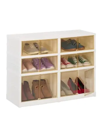 Mit dem Schuhkasten bringst Du Übersicht in Deine Schuhsammlung und sorgst für einen aufgeräumten Eingangsbereich. Dank der Klappfunktion ist die Schuhvitrine im Nu aufgebaut und einsatzbereit. Der Schuhbutler verfügt über hohe und flache Fächer, in denen sich sowohl Stiefel als auch Pumps, Sneaker und Sandalen verstauen lassen. Dank der durchsichtigen Türen behältst Du stets einen guten Überblick über Deine Schuhe. Durch die Rollen lässt sich der Sneaker-Schrank zudem leicht verschieben.Faltbarer Schuhschrank im Detail – Größe S H x B x T: ca. 66,5 x 86,5 x 34,5 cm, ca. 6 kg – Größe M H x B x T: ca. 118 x 86,5 x 34,5 cm, ca. 10,6 kg – Größe L H x B x T: ca. 169 x 86,5 x 34,5 cm, ca. 15,2 kg – Maße kleine Fächer H x B x T: ca. 17 x 42 x 32 cm – Maße große Fächer H x B x T: ca. 29,5 x 42 x 31,5 cm – Material: Kunststoff – Farbe: Weiß, BraunSchuhregal mit Rollen – Ordentliche und übersichtliche Schuhaufbewahrung – Auf geringer Stellfläche viele Schuhpaare verstauen – Flache und hohe Fächer für verschiedene Schuharten – Unkomplizierter Auf- und Abbau dank klappbarem Design – Durchsichtige Türen mit Magnetverschluss für guten Überblick – Mit Rollen zum leichten Verschieben der Schuhkommode – Ideales Schuhgestell für Flur, Diele und AnkleidezimmerLieferumfang – 1x Schuhschrank – Mit Anleitung – Dekoartikel sind nicht im Lieferumfang enthalten