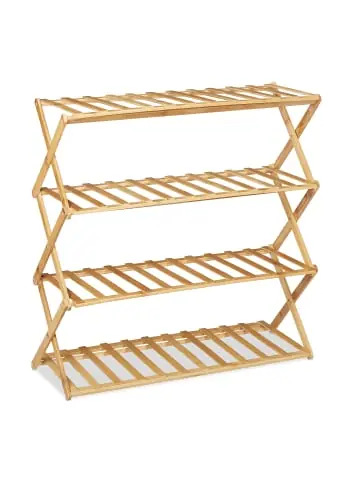 Das schicke Schuhregal aus Bambus bietet auf seinen vier Ebenen Aufbewahrung und Organisation für ca. 12 Paar Schuhe. Durch die schmale Form passt das Bambusregal perfekt in Flur und Diele. Dank dem genialen Klappdesign kann der Schuhständer einfach und platzsparend verstaut werden. Dadurch ist die Schuhablage auch unterwegs beim Camping und im Wohnwagen immer dabei. Hier sorgt der Schuhturm für Ordnung im Zelt und Wohnmobil, damit Ihre Schuhe, Stiefel und Sneaker nicht herumliegen.Schuhregal im Detail – Maße H x B x T: ca. 68 x 67 x 26 cm – Gewicht: ca. 2,2 kg – Material: Bambus – Farbe: Natur Schuhständer mit 4 Ebenen – Maße gefaltet H x B x T: ca. 9 x 67 x 33 cm – Ablagen B x T: ca. 63 x 25 cm – Abstand zwischen den Ebenen: ca. 20 cm – Abstand zwischen dem Bodengitter: ca. 3,5 cm- Traglast: ca. 16 kgSchuhablage in moderner Optik – Passt sich flexibel an Ihre Bedürfnisse an – Dank klappbarem Design ideal auch für unterwegs – Praktische Organisation auch im Zelt oder Wohnwagen – Großer Stauraum auf vier Ebenen – Bietet Platz für Schuhe, Sneaker und StiefelLieferumfang – 1x Schuhregal – Anleitung – Dekoartikel sind nicht im Lieferumfang enthalten