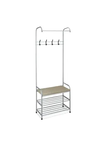 Diese praktische Stehgarderobe bringt Ordnung in Deinen Eingangsbereich. Schuhe, Jacken, Handtaschen und Schals hast Du mit der kompakten Kleidergarderobe alle an einem Platz. Neben einer Kleiderstange, 4 Jackenhaken und 2 Schuhablagen bietet Dir das Garderobengestell auch eine gepolsterte Sitzfläche, auf der Du Dich zum Anziehen Deiner Schuhe kurz niederlassen kannst. Die Jackengarderobe besteht aus robustem Metall, ist schnell aufgebaut und kann ganz ohne Bohren frei im Raum platziert werden.Garderobe im Detail- Gesamtmaße H x B x T: ca. 173 x 64 x 30 cm- Max. Traglast Ablagen / Kleiderstange: je 8 kg- Max. Traglast Haken: je 1 kg- Max. Traglast Sitzbank: 60 kg- Gewicht: ca. 4,1 kg- Material: Stahl, Schaumstoff, Polyester – Verschiedene FarbenSchuhregal mit Garderobe- Schuhablagen B x T: ca. 60 x 29,5 cm- Ablagenabstand: ca. 16,5 cm- Sitzhöhe: ca. 47,5 cm- Kleiderstange B x D: ca. 60 x 1,5 cm- Haken H x B x T: ca. 11 x 1,5 x 3 cmFreistehender Jackenständer für den Flur- Mit Kleiderstange und Haken für Jacken, Mäntel, Schals etc. – 2 Gitterablagen für Deine liebsten Schuhpaare – Gepolsterte Fläche zum Hinsetzen bei Bedarf – Dank kompakter Größe ideal auch für kleinere Räume – Garderobe ist freistehend und ohne Bohren platzierbar Lieferumfang – 1x Garderobenständer in Einzelteilen – Anleitung und Montagematerial – Dekoartikel sind im Lieferumfang nicht enthalten