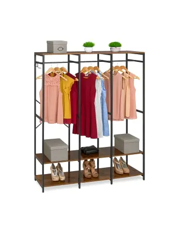 Du brauchst Platz für Kleidung, willst aber keinen geschlossenen Schrank? Dann ist dieser Kleiderständer genau richtig. Mit seiner Stange, den flexiblen Haken und 3 geräumigen Ablagen nutzt Du Deinen Raum optimal. Die Garderobe mit robustem Eisenrahmen und Platten in Holzoptik passt perfekt in Flur oder Schlafzimmer. Durch die offene Bauweise des vielseitigen und funktionalen Garderobenständers sind Jacken, Hosen und Accessoires jederzeit griffbereit und übersichtlich untergebracht.Garderobe im Detail – Kleiderstange B x D: je ca. 44,5 x 1,5 cm – Traglast je Haken: ca. 5 kg – Traglast Kleiderstange: ca. 20 kg – Traglast je Ablage: ca. 40 kg – Material: Eisen, MDF – In verschiedenen Farben erhältlichGarderobe L – Größe L H x B x T: ca. 180 x 94,5 x 40 cm / 18,7 kg – Obere Ablage Maße B x T: ca. 94,5 x 40 cm – Untere Ablagen Maße B x T: ca. 94,5 x 36 cm – Ablagenabstände: ca. 30 / 138,5 cmGarderobe XL – Größe XL H x B x T: ca. 180 x 141 x 40 cm / 27,2 kg – Obere Ablage Maße B x T: ca. 141 x 40 cm – Untere Ablagen Maße B x T: ca. 141 x 36 cm – Ablagenabstände: ca. 30 / 139,5 cm Offener Kleiderständer mit Kleiderstangen – Ideal für den Einsatz im Flur, Schlafzimmer oder Ankleidezimmer – Perfekt zur offenen Aufbewahrung von Jacken, Hemden, Hosen uvm. – Mit abnehmbaren Haken für Taschen, Hüte oder Schals – Geräumige Ablagen für Schuhe, Boxen oder Taschen – Dekorative Optik mit Metallrahmen und Platten in Holzoptik – Mit verstellbaren Füßchen zum Ausgleich von BodenunebenheitenLieferumfang – 1x Kleiderschrank in Einzelteilen – 4x S-Haken – Mit Anleitung – Mit Montagematerial – Dekoartikel sind nicht im Lieferumfang enthalten
