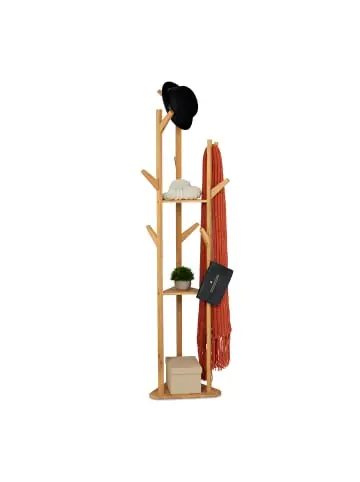 Mit diesem dreieckigen Garderobenständer sorgst Du für Ordnung in Deinem Flur und hast Deine Kleidung stets griffbereit. Die 9 Haken bieten ausreichend Platz für Jacken, Schals, Mützen und Taschen – insbesondere in der kalten Jahreszeit wird die Standgarderobe damit zu einem unverzichtbaren und zugleich dekorativen Einrichtungselement. Der Kleiderständer aus Bambus ist mit seiner natürlichen Ästhetik ein absoluter Hingucker und bietet auf 2 Ablageflächen zusätzlichen Stauraum.Garderobenständer im Detail – Gesamtmaße H x B x T: ca. 168,5 x 47 x 47 cm – Haken H x B x T: ca. 5 x 1,7 x 14,5 cm – Ablagen B x T: ca. 26 x 23 cm – Traglast: ca. 20 kg – Gewicht: ca. 3,9 kg – Material: Bambus – Farbe: NaturElegante Standgarderobe aus Bambus – 9 Haken für Jacken, Mäntel, Schals, Taschen uvm. – Zusätzlicher Stauraum dank 2 kleiner Ablageflächen – Freistehend und individuell platzierbar im Flur, Büro etc. – Schneller Aufbau – Einfach zusammenschrauben – Dank niedriger Haken auch für Kinder geeignet – Natürliche Ästhetik als Highlight zu HauseLieferumfang – 1x Garderobenständer in Einzelteilen – Inkl. Montagematerial – Dekorartikel sind nicht im Lieferumfang enthalten