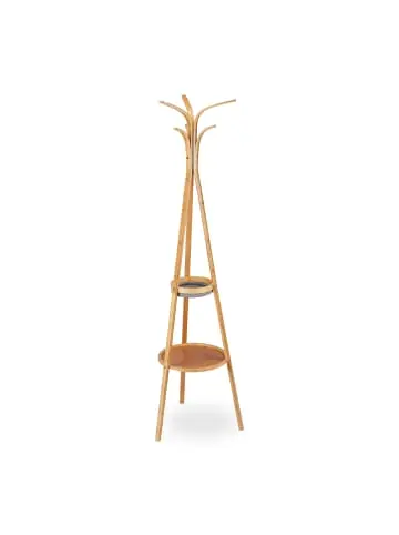 Mit diesem Garderobenständer in Baumform erhalten Sie ein funktionales und gleichzeitig stilvolles Deko-Element für Ihre Einrichtung. Insgesamt 6 Haken bieten ausreichend Platz für Jacken, Mäntel, Schals und Taschen. Auf der unteren Ablagen können Sie Mützen, Hüte oder Deko ablegen, während das obere Fach aus Stoff für kleinere Accessoires sowie Schlüssel geeignet ist. Die freistehende Garderobe aus Bambus in natürlicher Optik ist ebenso im Büro ein Hingucker wie in den eigenen vier Wänden.Garderobenständer im Detail – Maße H x B x T: ca. 178 x 50 x 50 cm – Gewicht: ca. 2,7 kg – Traglast je Haken: ca. 5 kg – Traglast je Ablage: ca. 10 kg – Material: Bambus, Polyester – Farben: natur, grauWeitere Maße der Flurgarderobe – Einkerbung große Haken B: ca. 1,8 cm – Höhe der Haken: ca. 165 bzw. 178 cm – Innenmaße kleine Ablage H x D: ca. 5 x 20,5 cm – Innenmaße große Ablage H x D: ca. 1 x 35 cm – Ablagenabstand: ca. 37,5 cmStandgarderobe für Flur, Büro oder Wartezimmer – Mit 6 Haken für Jacken, Jacketts, Schals uvm. – Große Haken verfügen über Einkerbungen für Taschen – 2 runde Ablagen für Hüte, Mützen oder Accessoires – Dekoratives Baum Design aus Bambus in natürlicher Optik – Freistehend und individuell platzierbar – Kein Bohren nötigLieferumfang – 1x Garderobenständer in Einzelteilen – Mit Anleitung und Montagematerial – Dekorationsartikel sind im Lieferumfang nicht enthalten