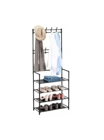 Mit diesem platzsparenden Garderobenständer mit Schuhablagen bringst Du Ordnung in Flur, Schlaf- oder Ankleidezimmer. Auf 4 Ebenen finden bis zu 12 Paar Schuhe, Taschen oder Aufbewahrungsboxen ihren Platz. 8 Doppelhaken bieten zusätzlichen Stauraum für Jacken, Schals, Hüte oder Schlüssel. Dank Stecksystem ist der Aufbau der Schuhgarderobe schnell und einfach erledigt. Das moderne Design aus pulverbeschichtetem Metall und Vliesstoff passt sich jedem Wohnstil an.Garderobenständer im Detail – Gesamtmaße H x B x T: ca. 150,5 x 59,5 x 25 cm – Abstand der Ablagen: ca. 16 cm – Traglast je Ablage: max. 10 kg – Traglast je Haken: max. 5 kg – Materialien: Stahl, Vlies, PP – Farbe: SchwarzStandgarderobe mit Schuhregal – Platzsparende Garderobe durch schmale Bauweise – 4 Ablagen für bis zu 12 Paar Schuhe, Taschen oder Boxen – 8 Doppelhaken für Jacken, Taschen, Hüte oder Schals – Offenes Design für schnellen Zugriff auf Schuhe und Accessoires – Robuster Eisenrahmen mit Ablagen aus Vliesstoff – Einfacher Aufbau dank praktischem Stecksystem – Vielseitig einsetzbar in Flur, Schlafzimmer, Ankleidezimmer, Bad und mehrLieferumfang – 1x Schuhorganizer in Einzelteilen – Mit Anleitung – Mit Montagematerial – Dekoartikel sind nicht im Lieferumfang enthalten