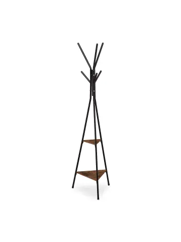 Dieser moderne Garderobenständer bietet mit insgesamt 6 Haken ausreichend Platz für Jacken, Mäntel, Schals, Taschen und andere Kleidungsstücke. Auf den 2 Ablagen können Schlüssel, Mützen, Deko und weitere Accessoires untergebracht werden. Der freistehende Jackenständer mit stabilem Dreibein-Gestell kann nach Belieben im Büro, Flur oder Schlafzimmer platziert werden. Dort überzeugt die Standgarderobe besonders durch ihren industriellen Mix aus schwarzem Metall und brauner Holzoptik.Garderobenständer im Detail – Gesamtmaße H x B x T: ca. 181,5 x 50 x 43 cm – Gewicht: ca. 3 kg – Material: Eisen, MDF, Kunststoff – Farbe: Schwarz, BraunKleiderständer im Industrie Design – Maße große Ablage B x T: ca. 37 x 33 cm – Maße kleine Ablage B x T: ca. 21 x 19,5 cm – Durchmesser Haken: ca. 1,9 cm – Höhe der Haken: ca. 149 und 181,5 cm – Max. Traglast: ca. 25 kgFreistehender Jackenständer für den Eingangsbereich – Für mehr Ordnung im Flur, Büro, Schlafzimmer etc. – 6 Haken für Jacken, Mäntel, Hüte, Taschen uvm. – Freistehendes Dreibein-Gestell für stabilen Stand – Mit 2 Ablagen für Schlüssel, Deko oder Accessoires – Industrieller Mix aus Schwarz und brauner HolzoptikLieferumfang – 1x Garderobenständer in Einzelteilen – Mit Anleitung und Montagematerial – Dekorationsartikel sind im Lieferumfang nicht enthalten