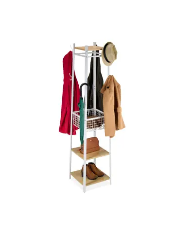 Verwandle Deinen Flur mit diesem Garderobenständer in einen einladenden Ort der Ordnung. Die Garderobe kombiniert acht Doppelhaken auf zwei Höhen mit drei Ablagen und einem Drahtkorb, sodass Jacken, Mäntel, Taschen und Accessoires ihren Platz finden. Das luftige, offene Design des Hakenständers macht das An- und Ablegen leicht und bringt zugleich Struktur vor allem in schmale Flure. Der Mantelständer bereichert mit seinem modernen Mix aus Holzoptik und Metall jeden Eingangsbereich.Garderobenständer im Detail – Gesamtmaße H x B x T: ca. 181 x 43 x 43 cm – Traglast je Haken: ca. 5 kg – Traglast je Ablage: ca. 20 kg – Gewicht: ca. 10,2 kg – Material: MDF, Eisen – In verschiedenen Farben erhältlichStandgarderobe mit Haken – Ablage unten B x T: ca. 40 x 40 cm – Ablage Mitte B x T: ca. 38,5 x 38,5 cm – Ablage oben B x T: ca. 30 x 30 cm – Ablagenabstand: ca. 34 cm – Korb innen H x B x T: ca. 16 x 31,5 x 31,5 cm – Hakenmaß H x B x T: ca. 9 x 3 x 4 cm – Höhe Haken: ca. 139 cm / ca. 173,5 cmVielseitiger Kleiderständer für Dein Zuhause – Kombinierte Garderobe mit 8 Doppelhaken und 3 Ablagen – Mehrere Ebenen plus integriertem Drahtkorb – Stauraum für Mützen, Schals, Taschen und Accessoires – Haken rundum auf 2 Höhen für Kleidung, Jacken etc. – Moderner Look durch Materialmix aus Holz und Metall – Platzsparende Eckform für kleine Eingangsbereiche – Luftige, offene Konstruktion für schnelles An- und Ablegen – Nivellierfüßchen für stabilen Stand auf unebenem BodenLieferumfang – 1x Hutständer in Einzelteilen – 1x Kippschutz – Dekoartikel sind nicht im Lieferumfang enthalten