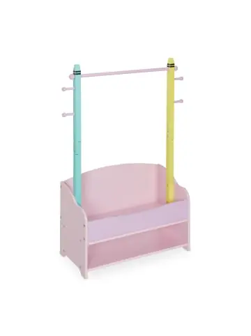 Die bunte Kleidergarderobe ist das ideale Möbelstück für das Kinderzimmer, um Kinder- und Babykleidung ordentlich aufzuhängen oder abzulegen. Neben einer Garderobenstange und 4 Kleiderhaken für Jäckchen, Kleidchen oder Shirts verfügt das Kleidergestell auch über 2 Ablagen. Hier finden zum Beispiel Hosen, Mützen oder Hausschuhe einen Platz. Dank der kindgerechten Größe der Standgarderobe können Deine Sprösslinge ihre Kleidung selbstständig aufräumen und so ganz nebenbei lernen, Ordnung zu halten.Kinder Kleiderständer im Detail – Gesamtmaße H x B x T: ca. 100,5 x 71 x 30 cm- Max. Traglast Stange: 5 kg – Max. Traglast je Fach: 15 kg – Gewicht: ca. 7,7 kg- Material: MDF, Kiefernholz – Farbe: Rosa, Gelb, TürkisKindergarderobe mit Ablagen- Kleiderstange B x D: ca. 52 x 2 cm- Kleiderhaken B x D: ca. 6,5 x 2,2 cm- Innenmaße oberes Fach H x B x T: ca. 9 x 57,5 x 26 cm- Innenmaße unteres Fach H x B x T: ca. 11,5 x 57,5 x 29 cmFreistehende Kinderzimmer-Garderobe – Garderobenständer mit Kleiderstange, Haken und Ablagen- Zum Aufhängen und Ablegen von Kleidung im Kinderzimmer – Kindgerechte Größe zum eigenständigen Aufräumen der Kleidungsstücke – Ansprechendes, farbenfrohes Design in Pastelltönen – Kleidergestell besteht aus robusten Materialien und steht stabilLieferumfang – 1x Kinder Garderobenständer in Einzelteilen – Montagematerial und Anleitung – Dekoartikel sind im Lieferumfang nicht enthalten