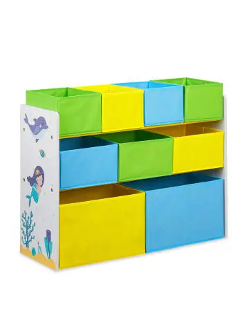 Von diesem Kinderregal werden vor allem die Kleinsten begeistert sein. Besonderer Hingucker sind die bunten Aufbewahrungsboxen in Kombination mit dem niedlichen Motiv. In den Boxen können Kinder ihre Spielsachen schnell und ordentlich verstauen. Bausteine, Kuscheltiere und Bücher finden hier Platz. Die Handhabung ist auf Kleinkinder ausgerichtet. Die faltbaren Stoffkisten sind so angebracht, dass sie leicht zu erreichen sind.Kinderregal im Detail – Maße gesamt H x B x T: ca. 66 x 82,5 x 29,5 cm – Maße Gestell H x B x T: ca. 60,5 x 82,5 x 29,5 cm – Maße kleine Boxen H x B x T: ca. 15 x 26 x 20 cm – Maße mittlere Boxen H x B x T: ca. 15 x 26,5 x 26,5 cm – Maße große Boxen H x B x T: ca. 25 x 40 x 26,5 cm – Gewicht: ca. 6,28 kgWeitere Details zum Kinderzimmerregal – Kleine Box belastbar bis 3 kg – Mittlere Box belastbar bis 4 kg – Große Box belastbar bis 5 kg – Material: Spanplatte, Metall, Polyester – Design: Bunt mit verschiedenen MotivenSpielregal fürs Kinderzimmer – Perfekt für Spiel- und Kinderzimmer – Faltbare Regalboxen aus Stoff in farbenfroher Optik – Für Kuscheltiere, Bücher, Bauklötze und andere Spielsachen – Niedliche Motive für Jungen und Mädchen – 9 Stofffächer für Kinder leicht zu erreichenLieferumfang – 1x Kinderregal in Einzelteilen – 9x Stoffbox – Montagematerial und Aufbauanleitung – Dekorationsartikel sind im Lieferumfang nicht enthalten