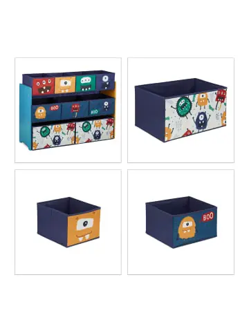 Die niedliche Kinderkommode mit Monster-Motiv ist ideal zur Spielzeugaufbewahrung im Kinderzimmer. Mit 9 faltbaren Stoffboxen in unterschiedlichen Größen steht ausreichend Stauraum für Kuscheltiere, Bauklötze, Bücher und mehr zur Verfügung. Dank der kindgerechten Höhe können bereits Kleinkinder das stabile Spielsachenregal selbstständig aus- und einräumen. Das Kinder-Aufbewahrungsregal eignet sich für Jungen und Mädchen und kann auch wunderbar in der Kita oder im Wartezimmer aufgestellt werden.Kinderregal im Detail – Gesamtmaße H x B x T: ca. 70 x 92,5 x 30 cm – Gesamtgewicht: ca. 6,3 kg – Traglast pro Box: 2 kg – Material: MDF, Stahl, Vliesstoff – Optik: Mehrfarbig mit Monster-MotivSpielzeugregal mit Boxen – 2x Große Box Innenmaße H x B x T: ca. 23 x 44 x 27 cm – 3x Flache Box Innenmaße H x B x T: ca. 17 x 29,5 x 25,5 cm – 4x Kleine Box Innenmaße H x B x T: ca. 16,5 x 22 x 25,5 cmAufbewahrungsregal fürs Kinderzimmer – Praktische Spielzeugablage für Spielsachen aller Art – Mit 9 faltbaren Stoffboxen in verschiedenen Größen – Kindgerechte Größe zum eigenständigen Ein- und Ausräumen – Spielzeugaufbewahrung zur Förderung des Ordnungssinns – Niedliches Design mit kleinen Monstern für Jungen und MädchenLieferumfang – 1x Kinderspielzeugregal in Einzelteilen – Mit Anleitung und Montagematerial – Dekorationsartikel sind im Lieferumfang nicht enthalten