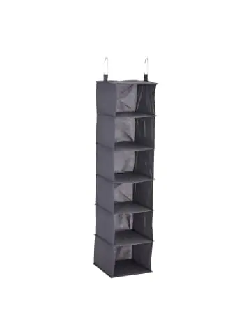 Mit diesem Hängeregal bringst Du Ordnung in Deinen Kleiderschrank und sorgst für zusätzlichen Stauraum an der Kleiderstange. In 6 offenen Fächern finden Kleidungsstücke, Handtücher oder auch Schuhe einen neuen Platz. Die verstärkten Böden sorgen dabei für die nötige Stabilität des Stoffregals, das ganz einfach mithilfe von 2 Metallhaken aufgehängt wird. Bei Nichtgebrauch lässt sich das Schrankhängeregal platzsparend zusammenfalten und kann auch wunderbar beim Camping zum Einsatz kommen.Kleiderschrank Hängeregal im Detail- Gesamtmaße H x B x T: ca. 139 x 30 x 30 cm- Höhe ohne Haken: ca. 123,5 cm- Innenmaße je Fach H x B x T: ca. 20 x 28 x 29 cm- Max. Traglast je Fach: ca. 1,5 kg- Gewicht: ca. 900 g- Material: Vlies, MDF, PappeHängender Kleiderschrank-Organizer aus Stoff- Schafft zusätzlichen Ablageplatz im Kleiderschrank – Zum Aufhängen an der Kleiderstange mithilfe von Haken – 6 Fächer für Kleidung, Schuhe, Accessoires, Handtücher etc. – Stabile Fertigung aus robustem Vliesstoff mit verstärkten Böden – Lässt sich schnell zusammenfalten und auf Reisen mitnehmen Lieferumfang – 1x Kleiderschrank-Hängeorganizer – 2x Metallhaken- Dekoartikel sind im Lieferumfang nicht enthalten