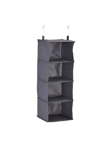 Mit diesem Hängeregal bringst Du Ordnung in Deinen Kleiderschrank und sorgst für zusätzlichen Stauraum an der Kleiderstange. In 4 offenen Fächern finden Kleidungsstücke, Handtücher oder auch Schuhe einen neuen Platz. Die verstärkten Böden sorgen dabei für die nötige Stabilität des Stoffregals, das ganz einfach mithilfe von 2 Metallhaken aufgehängt wird. Bei Nichtgebrauch lässt sich das Schrankhängeregal platzsparend zusammenfalten und kann auch wunderbar beim Camping zum Einsatz kommen.Kleiderschrank Hängeregal im Detail- Gesamtmaße H x B x T: ca. 97 x 30 x 30 cm- Höhe ohne Haken: ca. 82 cm- Innenmaße je Fach H x B x T: ca. 20 x 28 x 29 cm- Max. Traglast je Fach: ca. 2 kg- Gewicht: ca. 700 g- Material: Vlies, MDF, PappeHängender Kleiderschrank-Organizer aus Stoff- Schafft zusätzlichen Ablageplatz im Kleiderschrank – Zum Aufhängen an der Kleiderstange mithilfe von Haken – 4 Fächer für Kleidung, Schuhe, Accessoires, Handtücher etc. – Stabile Fertigung aus robustem Vliesstoff mit verstärkten Böden – Lässt sich schnell zusammenfalten und auf Reisen mitnehmen Lieferumfang – 1x Kleiderschrank-Hängeorganizer – 2x Metallhaken- Dekoartikel sind im Lieferumfang nicht enthalten