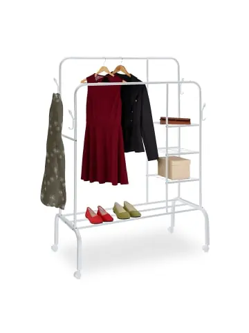 Verwandle Dein Zuhause in eine gut organisierte Garderobe mit diesem vielseitigen Kleiderständer auf Rollen. Die doppelten Kleiderstangen bieten Dir doppelt so viel Platz für Deine Kleidung, während die integrierten Regale Stauraum für Schuhe, Boxen oder dekorative Elemente schaffen. Dank der robusten Eisenkonstruktion ist dieser Kleiderständer nicht nur stabil, sondern auch langlebig. Die leichtgängigen Rollen ermöglichen Mobilität, sodass Du den Ständer bequem in jedem Raum nutzen kannst.Kleiderständer im Detail – Gesamtmaße H x B x T: ca. 154 x 110 x 55 cm – Regalfächer: 32,5 x 27 cm – Gesamttragkraft: ca. 60 kg – Gewicht: ca. 4,2 kg – Material: Eisen – In verschiedenen Farben erhältlichGarderobenstäder für Deinen Alltag – Bietet doppelt so viel Platz für Kleidung und sorgt für maximale Aufbewahrung – Regale bieten zusätzlichen Stauraum für Schuhe, Boxen oder Deko – Leichtgängige Rollen ermöglichen flexible Mobilität und einfaches Verschieben – Seitliche Haken helfen dabei, Accessoires wie Handtaschen und Schals ordentlich zu verstauen – Robuste Bauweise macht den Ständer stabil und langlebig für langfristige NutzungLieferumfang – 1x Kleiderständer in Einzelteilen – Mit Anleitung und Montagematerial – Dekoartikel sind nicht im Lieferumfang enthalten