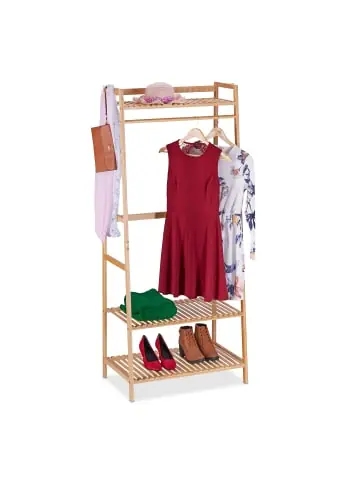 Mit dieser Kleidergarderobe schaffst Du wertvollen Stauraum in Flur, Schlaf- oder Gästezimmer. Jacken, Hemden, Blusen, Kleider und mehr sind mithilfe von Kleiderbügeln schnell und übersichtlich an der Garderobenstange aufgehängt. 3 Ablagen sowie 2 Kleiderhaken bieten Dir allerhand Platz für gefaltete Pullover, Schuhe, Taschen, Schals und mehr. Mit seiner schlichten und modernen Optik aus natürlichem Bambus passt das freistehende Garderobengestell wunderbar in jeden Raum.Kleiderständer im Detail- Gesamtmaße H x B x T: ca. 164 x 78 x 42 cm – Traglast Ablage: je max. 8 kg – Traglast Haken: je max. 2 kg – Gewicht: ca. 6 kg- Material: Bambus – Farbe: NaturKleiderstange mit 3 Ablagen – Kleiderstange B x D: ca. 66,5 x 2 cm – Obere Ablage B x T: ca. 66,5 x 25 cm – Mittlere Ablage B x T: ca. 66,5 x 38 cm – Untere Ablage B x T: ca. 66,5 x 41 cm – Kleiderhaken B x D: ca. 4 x 2,5 cmFreistehendes Kleidergestell aus Bambus- Kleiderstange für Hemden, Blusen, Kleider und mehr – Mit 3 praktischen Ablagen für Kleidung, Schuhe, Stiefel etc. – An den seitlichen Haken Jacken, Schals uvm. aufhängen – Gestell ist frei in Schlafzimmer oder Flur platzierbar- Offenes Design für schnelles An- oder Ablegen – Modernes, schlichtes Design aus natürlichem BambusLieferumfang- 1x Bambuskleiderständer in Einzelteilen – Anleitung und Montagematerial- Dekoartikel sind im Lieferumfang nicht enthalten