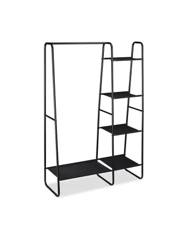 Dieser vielseitige Garderobenständer kann an vielen Orten Ihres Zuhauses eingesetzt werden. Im Flur eignet er sich als Standgarderobe für Jacken, Taschen und Hüte – im Schlafzimmer kann er als stilvoller offener Kleiderschrank genutzt werden. Praktisch ist er auch für das Trocknen und Zwischenlagern von Wäsche. Auf 5 Ablagen lassen sich Schuhe, Kleidung und Accessoires ablegen. Die Stange ist praktisch zum Aufhängen von Jacken, Blusen und Kleidern. Das moderne Design passt in viele Haushalte.Kleiderständer im Detail – Maße gesamt H x B x T: ca. 150 x 100 x 40 cm – Bodenfreiheit: ca. 18 cm – Traglast Ablagen: je ca. 6 kg – Traglast Kleiderstange: ca. 7 kg – Gewicht: ca. 4,5 kg – Material: Metall, Kunststoff – Farbe: SchwarzFlurgarderobe mit Ablagen und Kleiderstange – Breite Kleiderstange: ca. 60 cm – Abstand Kleiderstange – Ablage: ca. 130 cm – Ablage 1 B x T: ca. 33 x 22 cm – Ablage 2 B x T: ca. 33 x 28 cm – Ablage 3 B x T: ca. 33 x 33 cm – Ablage 4 B x T: ca. 33 x 38 cm – Ablage 5 B x T: ca. 60 x 38 cm – Abstand der Ablagen: ca. 36 cmPraktischer Kleiderständer für Flur und Zimmer – Kleiderstange für die Aufbewahrung von Jacken, Blusen – 5 Ablagen für Taschen, Hüte, Accessoires und Kleidung – Unterste Ablage ideal geeignet zum Abstellen von Schuhen – Nutzung im Flur als Garderobe oder im Zimmer als Kleiderschrank – Schlichtes und funktionales Design passt zu jeder EinrichtungLieferumfang – 1x Garderobenständer in Einzelteilen – 1x Anleitung – Mit Montagematerial – Dekoartikel sind nicht im Lieferumfang enthalten