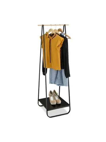Diese offene Flurgarderobe aus robustem Eisen schafft ordentlich Stauraum in Flur, Schlaf- oder Gästezimmer. Hänge Deine Jacken, Mäntel, Blusen und andere Kleidungsstücke übersichtlich an der Garderobe auf. Auf der Ablage des freistehenden Kleiderständers lassen sich Aufbewahrungsboxen, Schuhe oder Accessoires verstauen. Dank ihres schlichten, modernen Designs fügt sich die schwarze Metallgarderobe mit Stange in heller Holzoptik in jeden Einrichtungsstil perfekt ein.Kleiderständer im Detail – Maße H x B x T: ca. 141 x 56 x 45 cm – Traglast Kleiderstange: ca. 10 kg – Traglast Ablage: ca. 15 kg – Gewicht: ca. 3,9 kg – Material: Eisen – Farbe: Schwarz, NaturDetailmaße der Metallkleiderstange – Maße Kleiderstange innen B x D: ca. 38 x 1,5 cm – Maße Überstand Kleiderstange: je ca. 8 cm – Maße der Ablage B x T: ca. 38 x 45 cm – Abstand zwischen Ablage und Kleiderstange: ca. 126,5 cm Garderobenständer mit Ablage – Zum Aufhängen von Jacken, Hemden, Blusen, uvm. – Geräumige Ablage für Ordnungsboxen oder Schuhe – Für Flur, Diele, Büro, Ankleide- sowie Schlafzimmer – Schlichtes, schwarzes Design mit Stange in Holzoptik – Aus robustem und langlebigem Metall gefertigt – Aufbau mit wenigen Handgriffen erledigtLieferumfang – 1x Kleiderständer in Einzelteilen – Mit Anleitung und Montagematerial – Dekorationsartikel sind nicht im Lieferumfang enthalten