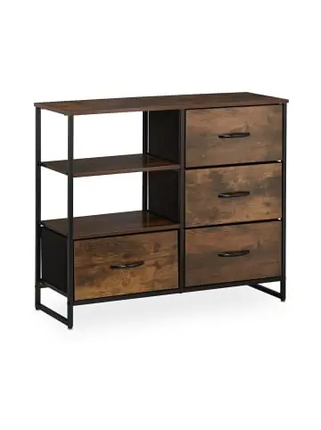 Diese Kommode schafft mit ihren 4 Schubladen und 2 offenen Fächern viel Stauraum. Egal ob für Bücher und Spiele im Wohnzimmer, Kleidung im Schlafzimmer oder Mützen und Schals im Flur – das Schubladenregal ist vielseitig verwendbar. Auf der oberen Ablage lassen sich Dekoartikel oder Pflanzen in Szene setzen. Optisch überzeugt die Hochkommode im Industrial-Design dank ihrer Kombination aus brauner Holzoptik und schwarzem Metallrahmen.Kommode im Detail – Maße H x B x T: ca. 71,5 x 84 x 32,5 cm – Gewicht: ca. 10,4 kg – Material: MDF, Eisen, Stoff – Farbe: Dunkelbraun, SchwarzWeitere Maße der Beistellkommode – Maße obere Ablage B x T: ca. 84 x 30 cm – Maße offene Fächer H x B x T: ca. 19 x 39 x 29 cm – Innenmaße Schublade H x B x T: ca. 19,5 x 38 x 27 cm – Traglast Ablage: max. 20 kg – Traglast je Schublade: max. 5 kgBrauner Kommodenschrank im Industrie-Design – Viel Stauraum dank 4 Schubladen und 2 offenen Fächern – Perfekt für Wohnzimmer, Schlafzimmer oder Flur – Dunkelbraune Nussbaum-Optik mit schwarzem Metallrahmen – Toller Hingucker im angesagten Industrial-Design – Inklusive Wandmontagematerial zur sicheren BefestigungLieferumfang – 1x Schlafzimmerkommode in Einzelteilen – Mit Montagematerial und Anleitung – Dekoartikel sind nicht im Lieferumfang enthalten