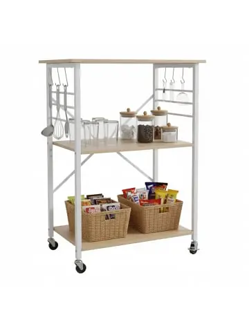 Verwandle Deine Küche in einen multifunktionalen Raum mit diesem vielseitigen Küchenwagen. Mit seinen drei Ebenen und sechs Haken bietet er reichlich Stauraum für Vorräte, Gewürze oder Küchenutensilien. Dank der robusten Konstruktion aus pulverbeschichtetem Stahlrahmen und MDF-Platten in Holzoptik ist er nicht nur langlebig, sondern auch ein echter Hingucker. Die vier Universalrollen, von denen zwei feststellbar sind, ermöglichen es Dir, das Rollregal mühelos zu bewegen und sicher zu fixieren.Küchenwagen im Detail – Maße H x B x T: ca. 89 x 60 x 40 cm – Abstand Ablagen: ca. 38 cm – Bodenfreiheit: ca. 7 cm – Tragfähigkeit der Ebenen: 10 kg pro Ebene – Material: Stahl, MDF – In verschiedenen FarbenVielseitiges Küchenregal mit 3 Ebenen – Vielseitig einsetzbar als Regal, Kaffee- oder Essecke – Ideal für kleine Räume dank kompakter Bauweise – Leicht zu bewegen und sicher zu fixieren durch Rollen mit Bremsfunktion – Hohe Stabilität durch pulverbeschichteten Stahlrahmen und X-Strebe auf der Rückseite – Zusätzlicher Stauraum durch 6 praktische Haken für Küchenutensilien – Großzügiger Abstand zwischen den Ebenen – auch für größere Küchengeräte – Stilvoller Look mit Holzoptik passend für jedes WohnambienteLieferumfang – 1x Küchentrolley in Einzelteilen – 6x S-Haken – Inkl. Montagematerial – Dekoartikel sind nicht im Lieferumfang enthalten