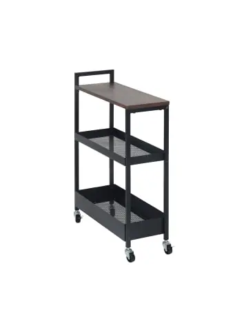 Der Rollwagen ist das perfekte Möbelstück, um auch in engen Nischen und Ecken Stauraum zu schaffen. Mit der offenen Ablage und den Korbenene bietet das schmale Regal viele Aufbewahrungsmöglichkeiten. Verstaue im Bad Kosmetikartikel, Toilettenpapier oder Handtücher darin. In der Küche eignet sich der Nischenwagen für Gewürze und andere Lebensmittel. Dank der 4 Rollen ist der Beistellwagen einfach verschiebbar. Zudem überzeugt das Rollregal mit seinem Industrial-Design.Nischenwagen im Detail – Material: pulverbeschichteter Stahl, MDF – Farbe: Schwarz, Braun Rollregal Variante 70 cm – Maße H x B x T: ca. 70 x 50 x 20 cm – Korbablage oben B x T: ca. 19,5 x 46,5 cm – Korbablage untenB x T: ca. 20 x 47,5 cm – MDF-Ablage H x B x T: ca. 1,5 x 19 x 48,5 cm – Traglast: ca. 15 kg Rollregal Variante 98 cm – Maße H x B x T: ca. 98 x 50 x 20 cm – Korbablage oben/mittig B x T: ca. 19,5 x 46,5 cm – Korbablage unten B x T: ca. 20 x 47,5 cm – MDF-Ablage H x B x T: ca. 1,5 x 19 x 48,5 cm – Traglast: ca. 20 kgSchmales Nischenregal mit Rollen – Das Schieberegal ist ideal für das Badezimmer oder die Küche – Zum Verstauen von Kosmetik, Putzmittel, Handtüchern uvm. – In der Küche für Vorratsgläser, Gewürze, Küchenutensilien etc. aufbewahren – Das Regal passt dank geringer Breite perfekt in Nischen und kleine Räume – Das Rollregal bietet viel Stauraum mit verschiedenen offenen Ablagen – Mobil dank 4 Rollen zum leichten Verschieben – Mit 2 Feststellbremsen – Industrial-Design aus schwarzem Metall mit Ablage in HolzoptikLieferumfang – 1x Rollwagen in Einzelteilen – Mit Anleitung – Mit Montagematerial – Dekoartikel sind nicht im Lieferumfang enthalten