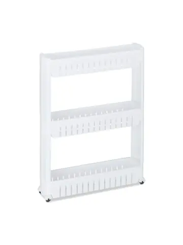 Der Rollwagen ist das perfekte Möbelstück für Bad oder Küche, um auch in engen Nischen und Ecken praktischen Stauraum zu schaffen. Mit 3 Ablagen bietet das schmale Nischenregal ausreichend Platz für Badutensilien, Küchenzubehör und andere Dinge des Alltags. Dank des offenen Designs und der 4 Rollen lässt sich der Nischenwagen bequem hin und her schieben und Du hast die verstauten Utensilien sofort griffbereit. Der Aufbau des Schieberegals geht dank des Stecksystems kinderleicht von der Hand.Nischenwagen im Detail- Maße H x B x T: ca. 71 x 12,5 x 54 cm- Maße Fächer H x B x T: ca. 9 x 11,5 x 48 cm – Abstand Fächer: ca. 30 cm – Traglast: max. 10 kg – Gewicht: ca. 1,2 kg – Material: Kunststoff – In verschiedenen FarbenSchmales Nischenregal mit Rollen – Ideal für kleine Bäder und schmale Küchen- Putzmittel, Küchenzubehör uvm. verstauen – Passt dank geringer Breite perfekt in Nischen – Mit 4 Rollen zum leichten Verschieben – Einfacher Aufbau dank Stecksystem – Schlichtes, modernes Design fügt sich gut ein – Pflegeleichter Kunststoff – Schnelle ReinigungLieferumfang – 1x Nischen Ordnungswagen in Einzelteilen – Mit Anleitung – Dekorationsartikel sind im Lieferumfang nicht enthalten
